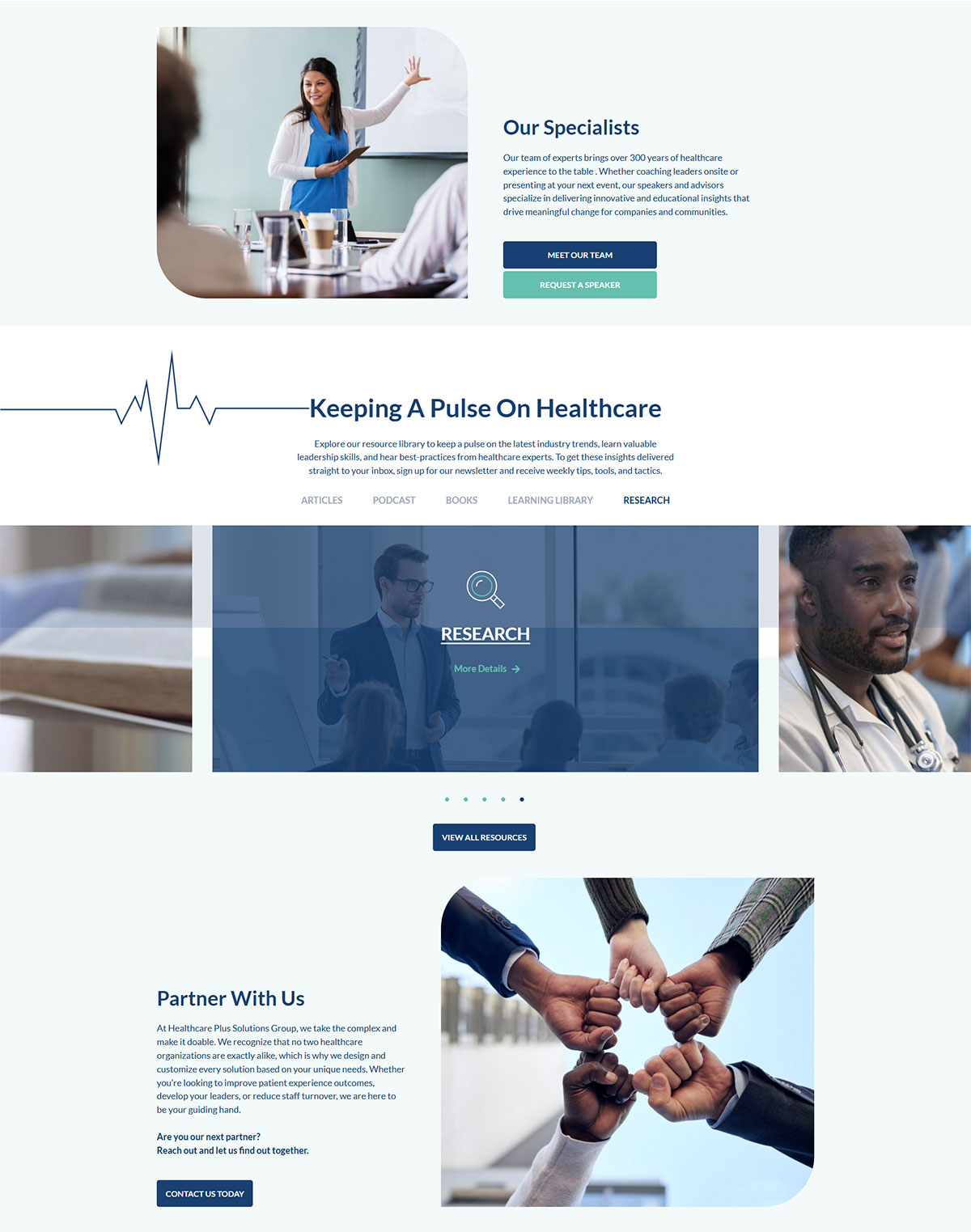 Developed a mobile friendly responsive WordPress website for Healthcare Plus Solutions Group, a healthcare consultancy that curates teams of experts and stakeholders to diagnose your most urgent pain points; design smart, collaborative solutions; and create a plan to execute in a way that gets quick, measurable results.